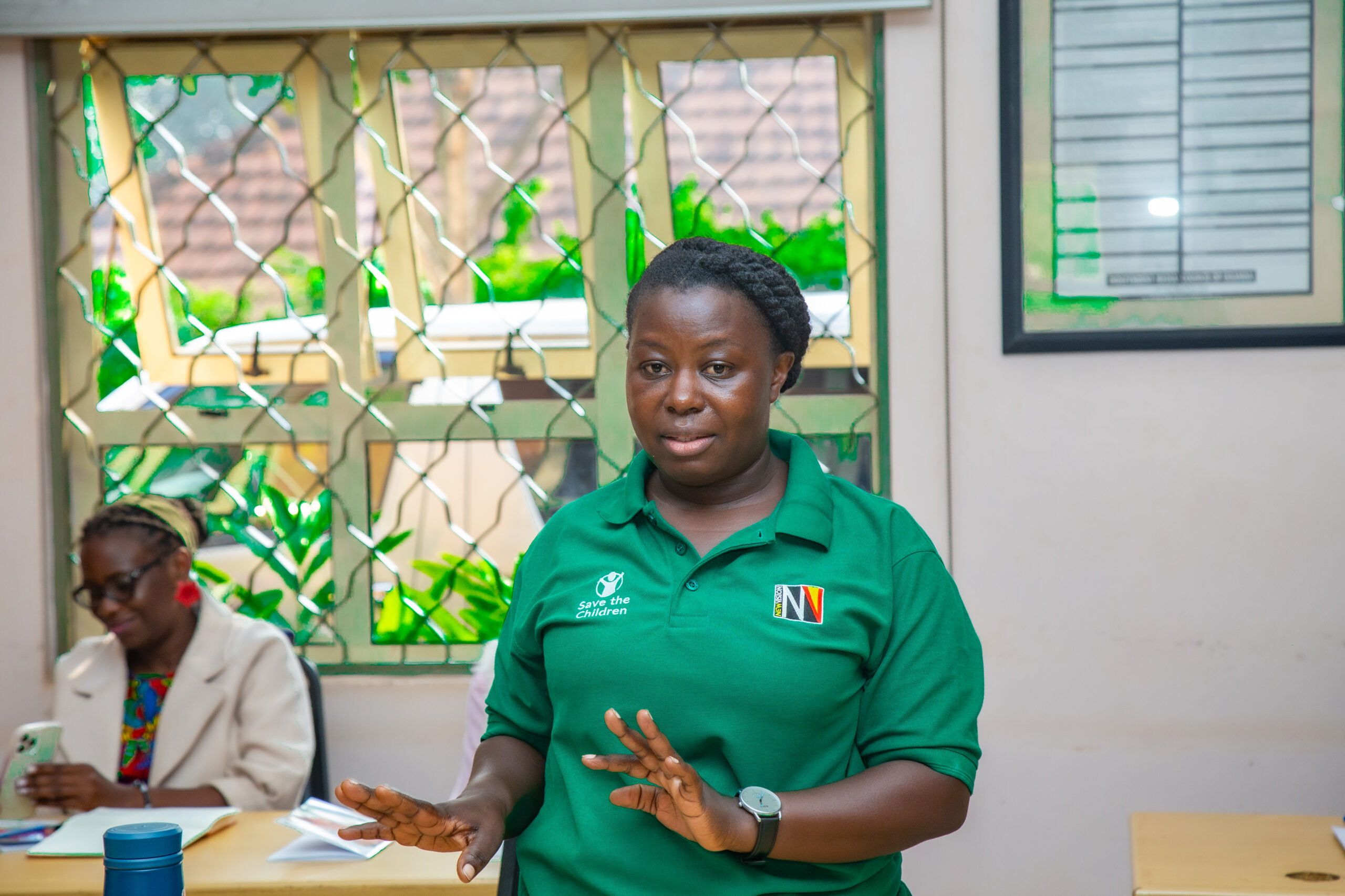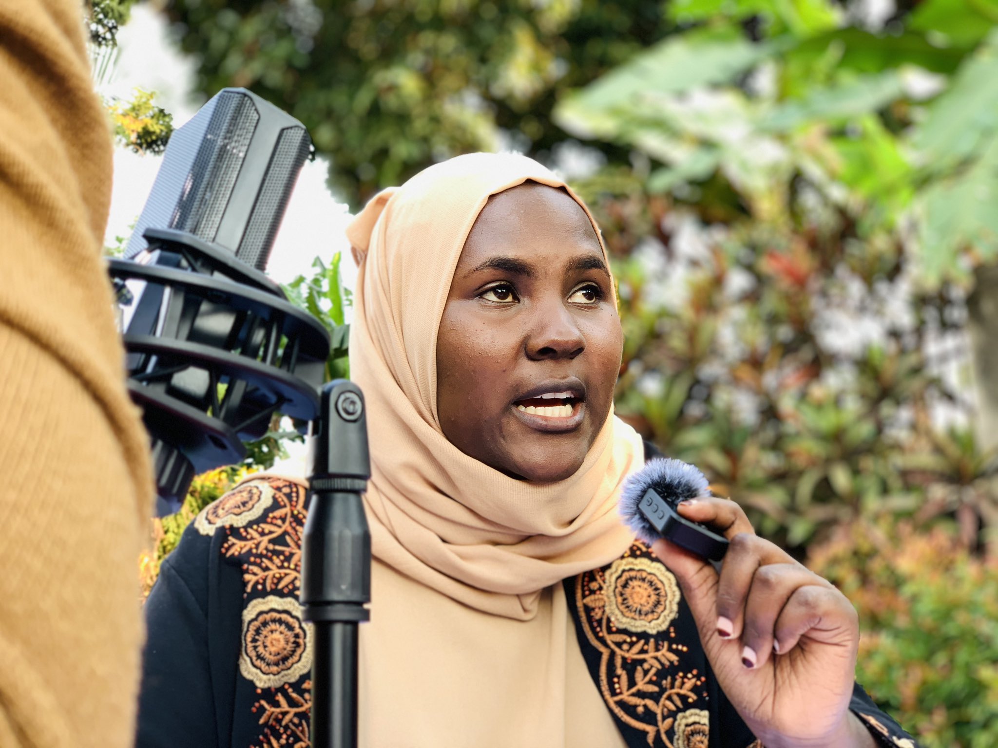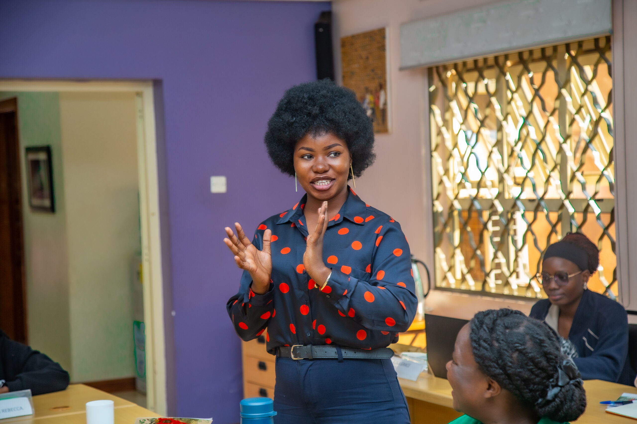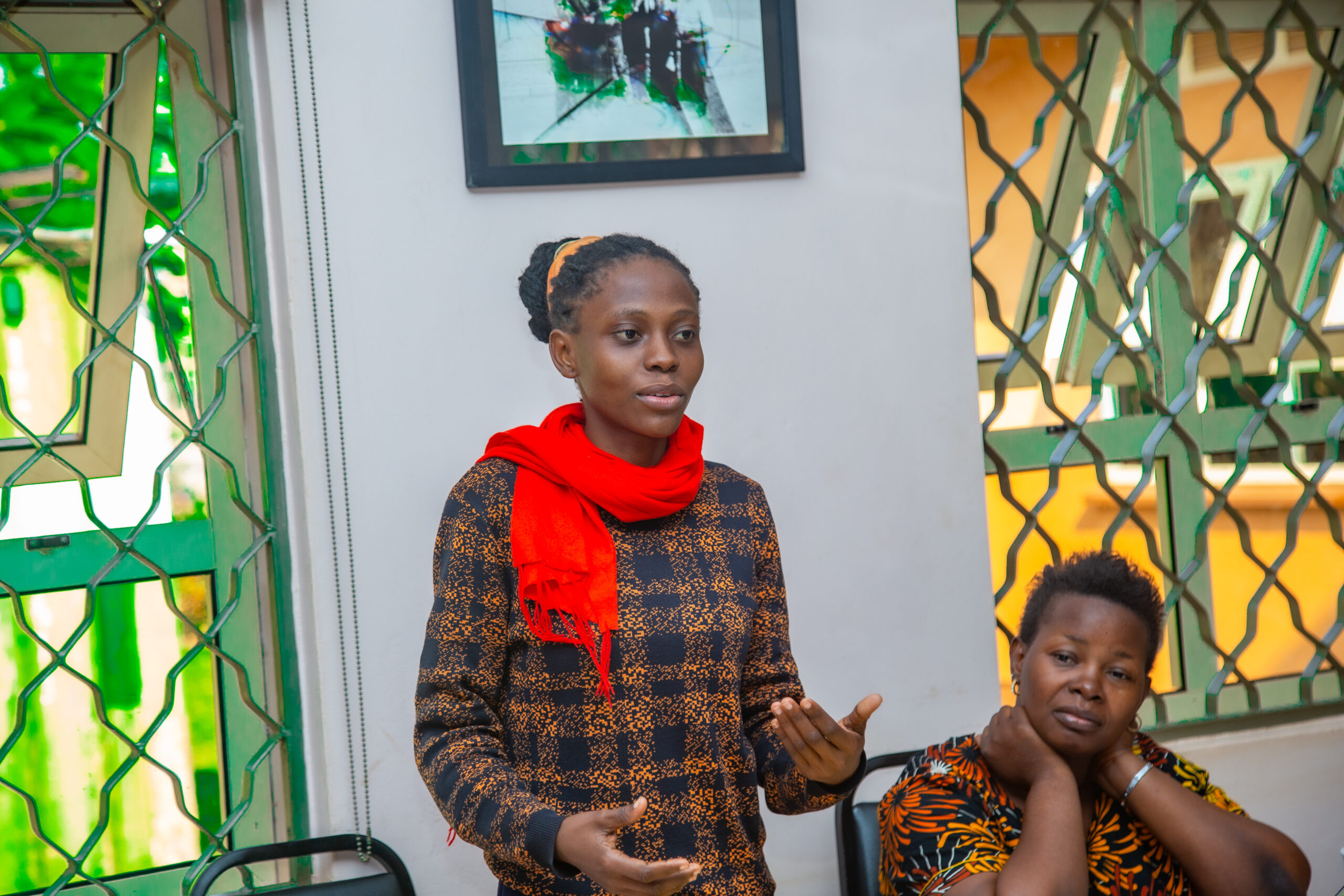 Esther Bridget Nakalya, one of the female journalists gestures and shares a response during the session